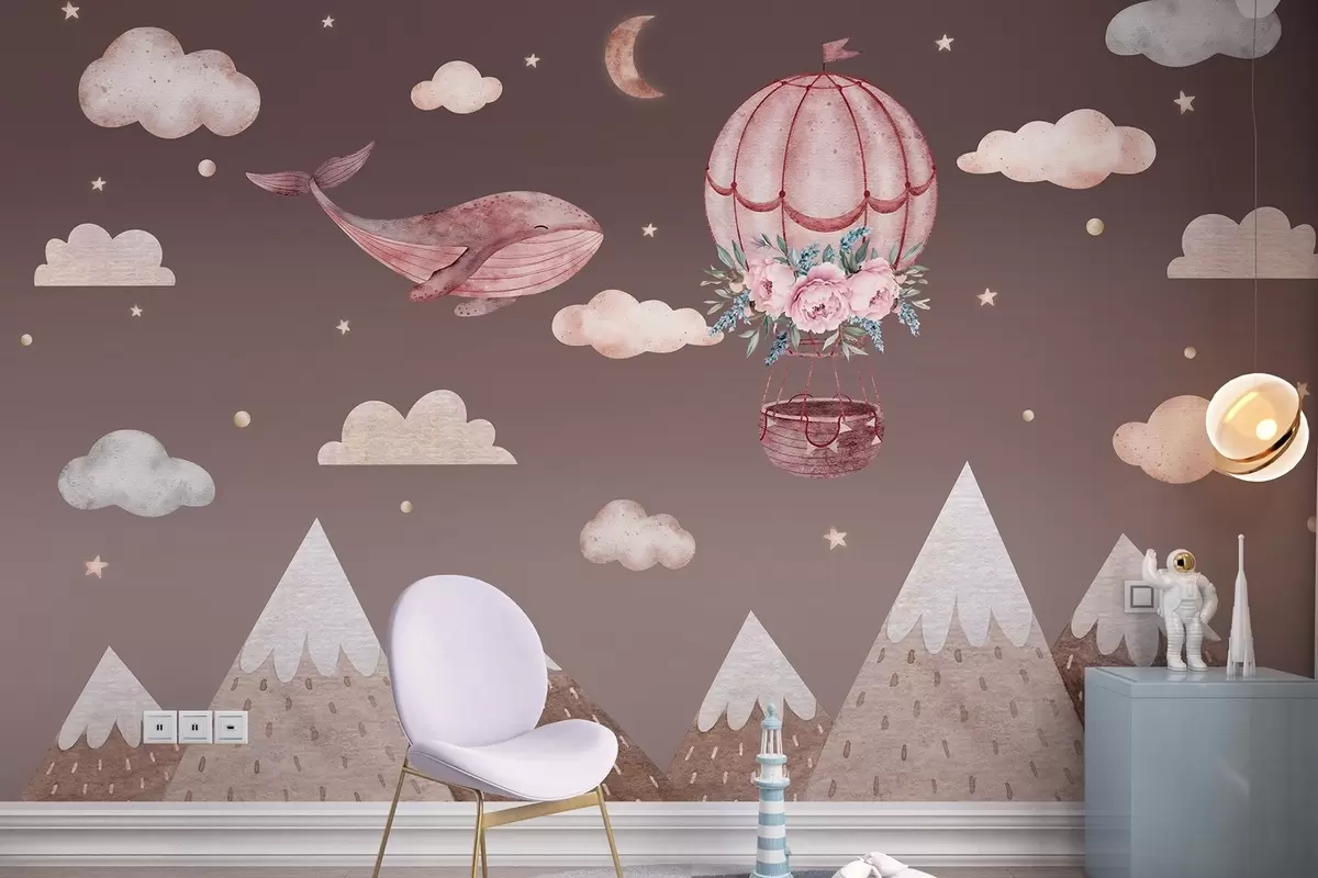 Fototapety Roztomilá velryba s balónem, tmavá obloha s mraky, hory, akvarel, růžové barvy Č. w03673v1