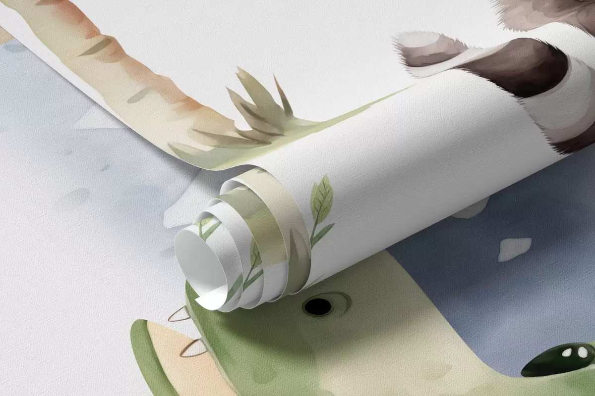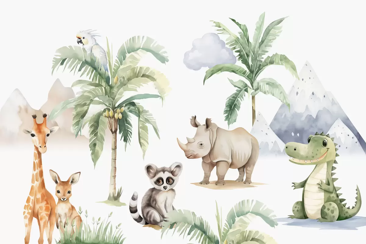 Fototapety Tropická zvířata v blízkosti palem imitace akvarelu Č. w03740