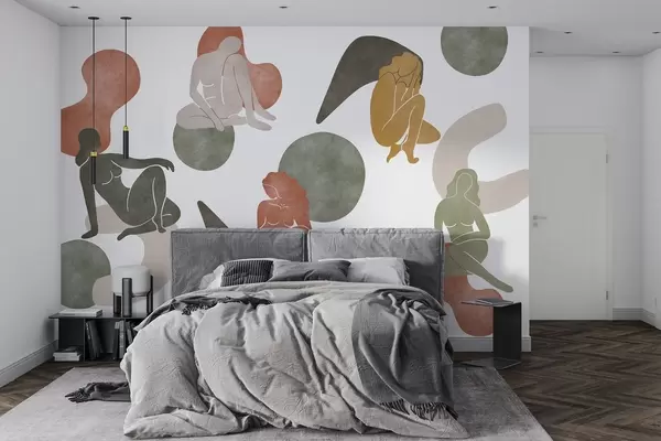 Fototapety Geometrické abstrakce s ženskými siluetami, boho styl, hnědá, béžová, zelená Č. w03753