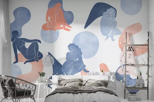 Fototapety Geometrické abstrakce s ženskými siluetami, boho styl, modrá, béžová, růžová Č. w03753v1