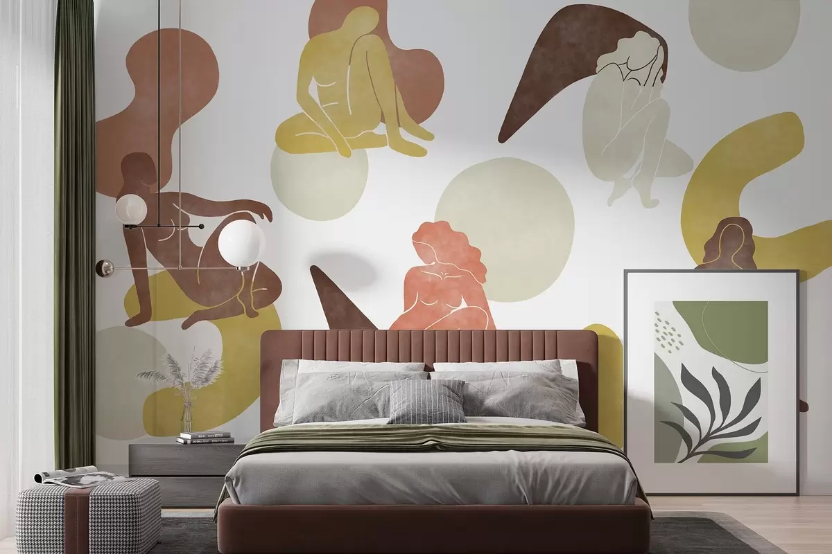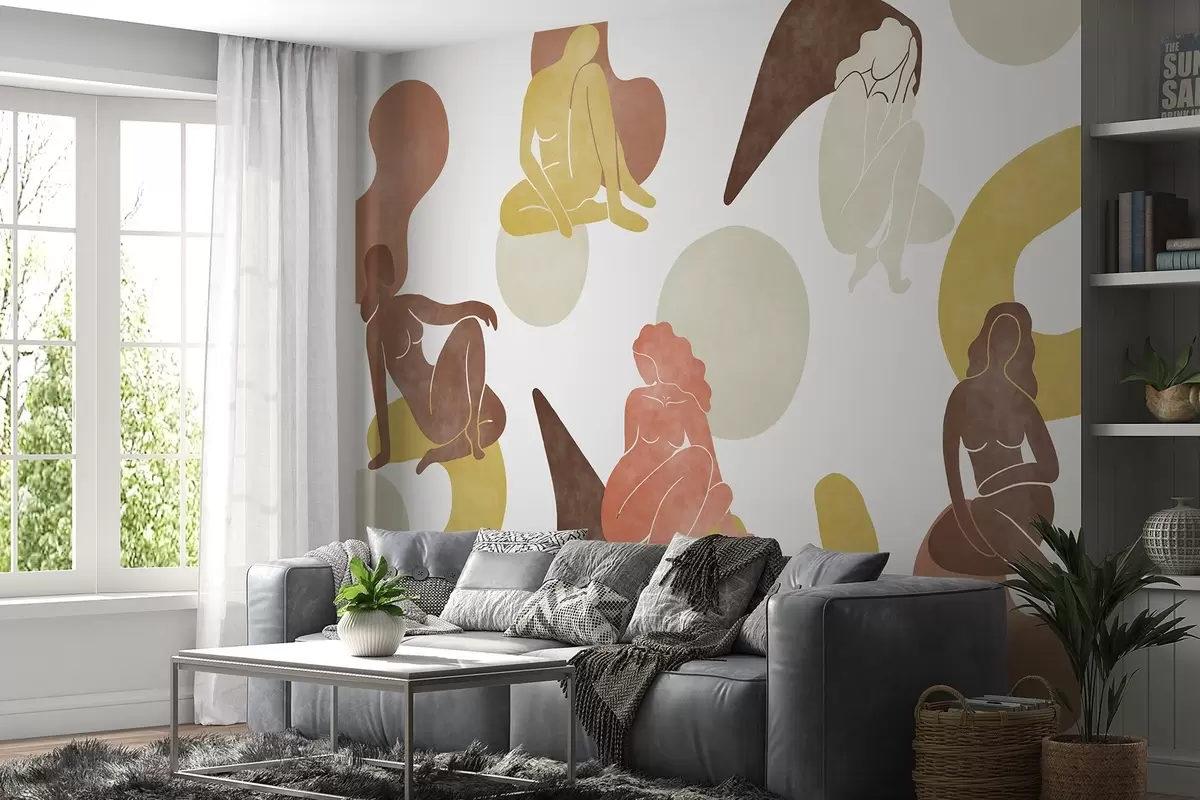 Fototapety Geometrické abstrakce s ženskými siluetami, boho styl, hnědá, béžová, žlutá Č. w03753v2