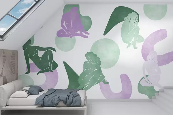 Fototapety Geometrické abstrakce s ženskými siluetami, boho styl, fialová, zelená Č. w03753v4