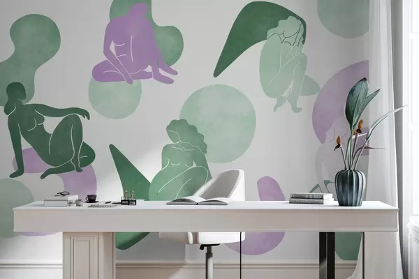 Fototapety Geometrické abstrakce s ženskými siluetami, boho styl, fialová, zelená Č. w03753v4