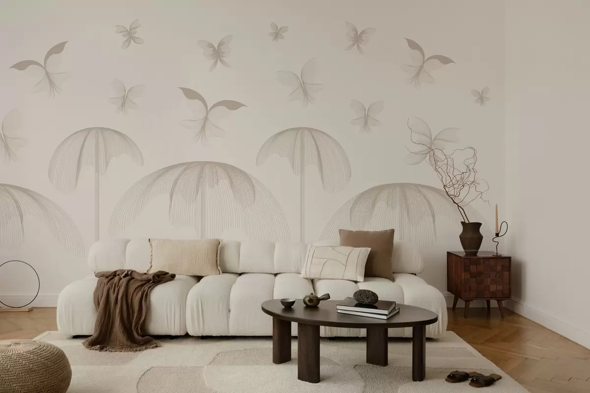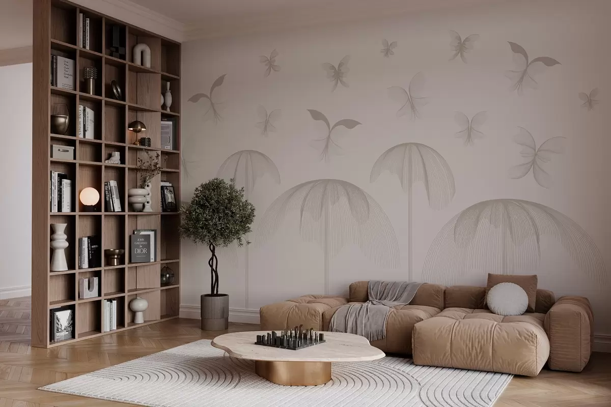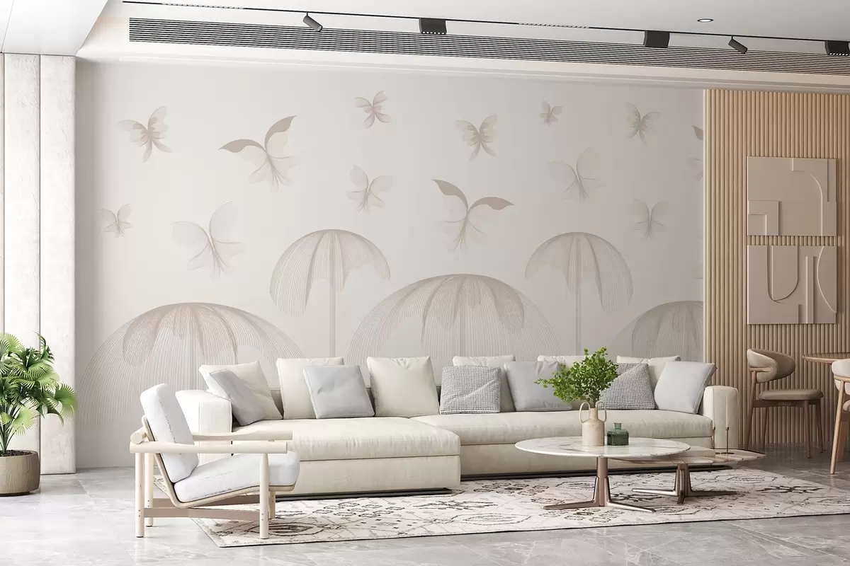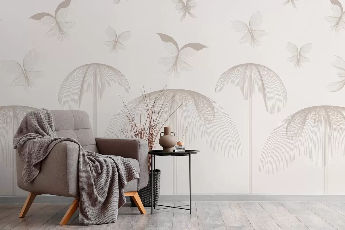 Fototapety minimalistické lineární tapety motýli a fontány na mléčném pozadí Č. w03762