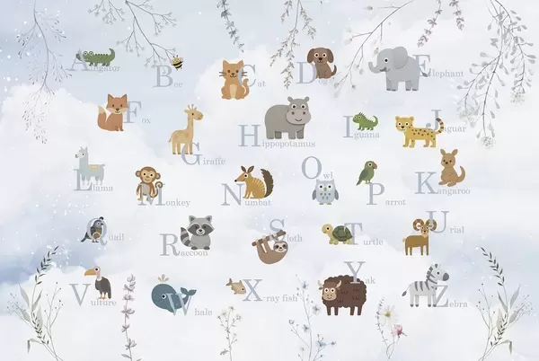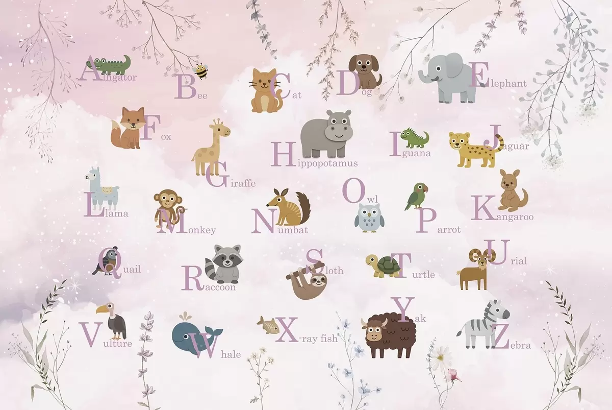 Fototapety Abeceda s růžovými písmeny, rostlinami a oblohou Č. w03809