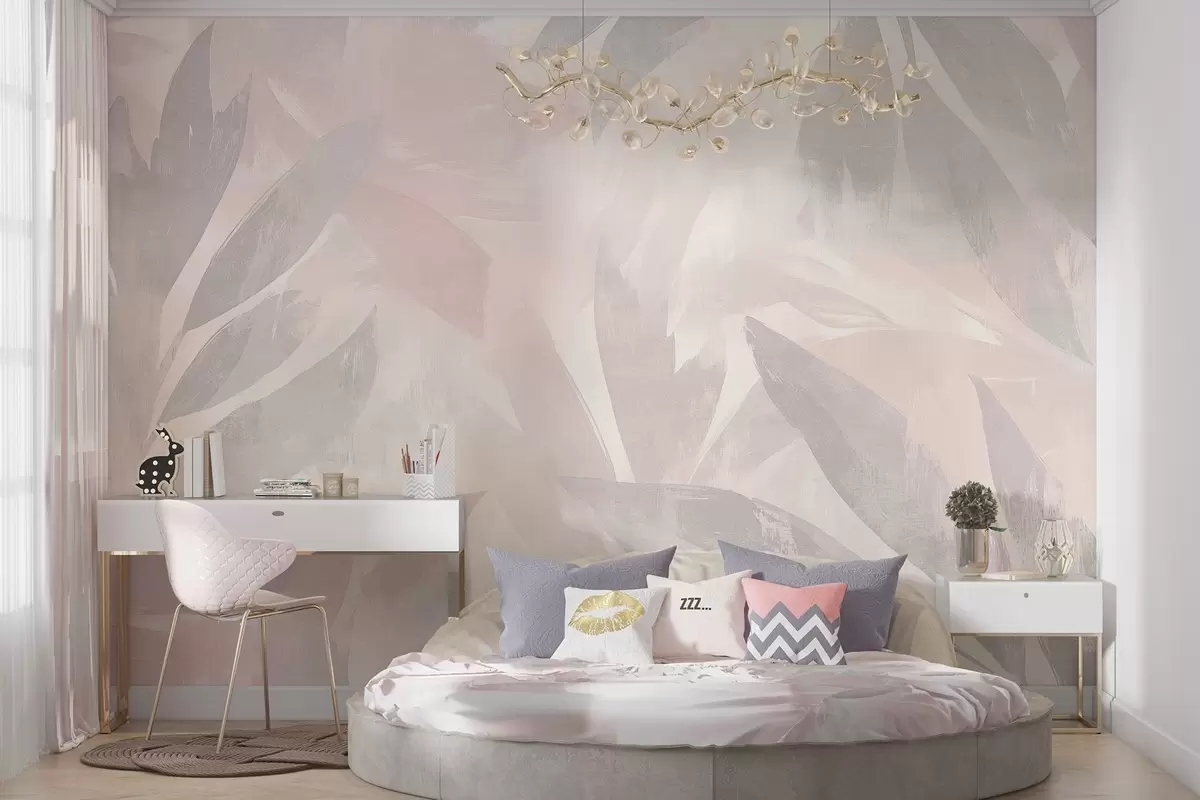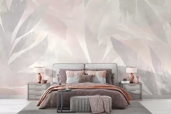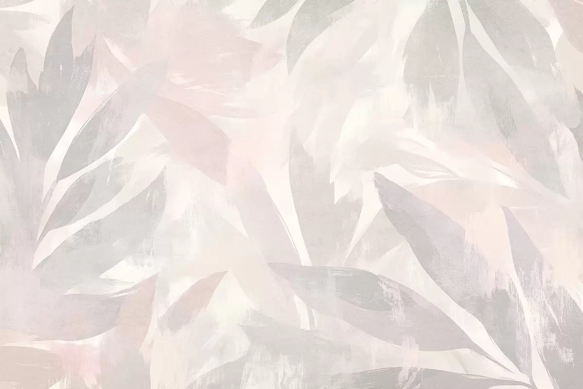 Fototapety Tropické listy, květinové, palmy, pastelový styl, růžové a béžové barvy Č. w03881
