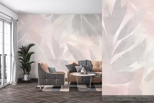 Fototapety Tropické listy, květinové, palmy, pastelový styl, růžové a béžové barvy Č. w03881