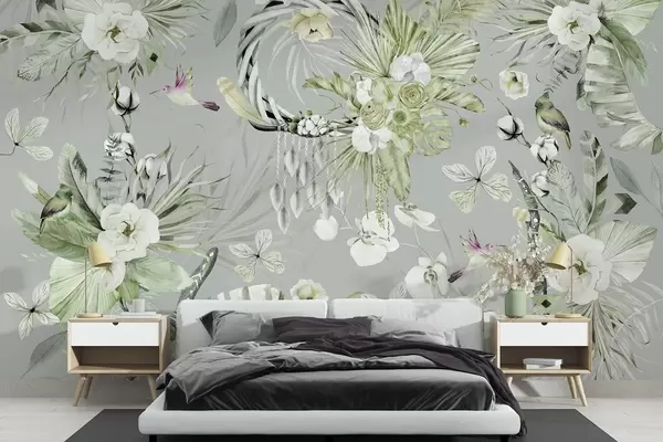 Fototapety Ozdoba v boho stylu s květy pivoněk a ptáky, akvarelový styl, zelené barvy Č. w03885v2