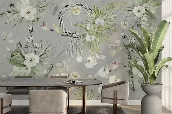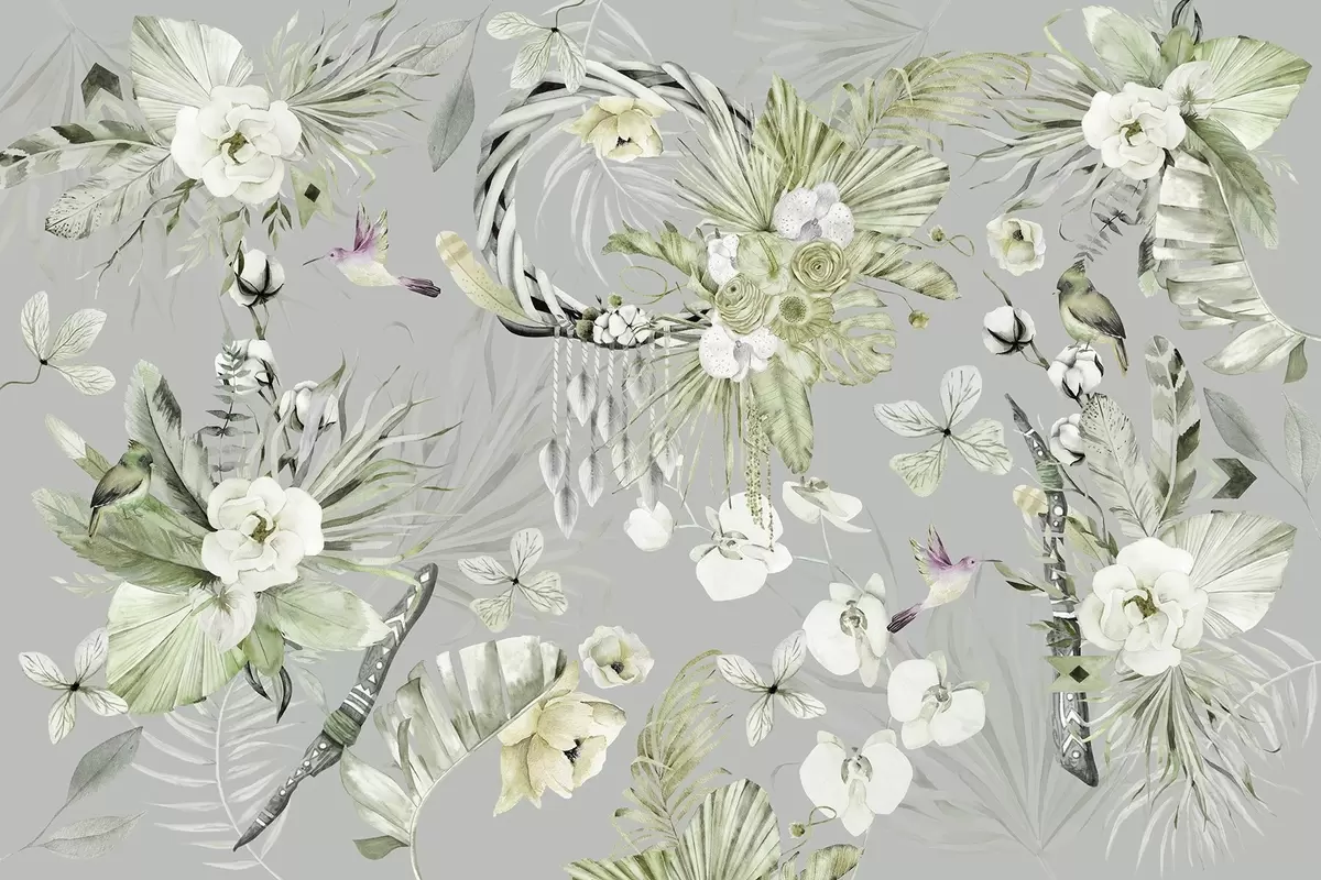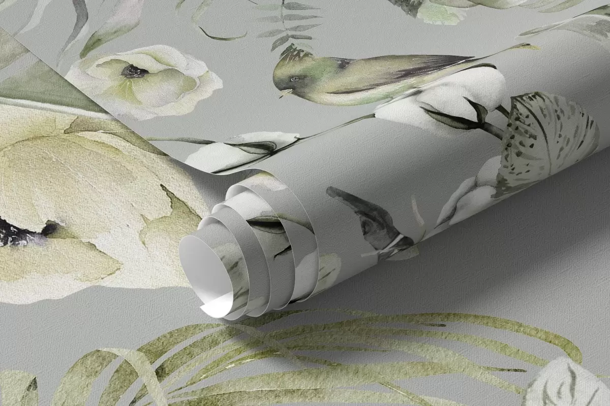Fototapety Ozdoba v boho stylu s květy pivoněk a ptáky, akvarelový styl, zelené barvy Č. w03885v2