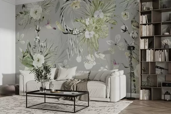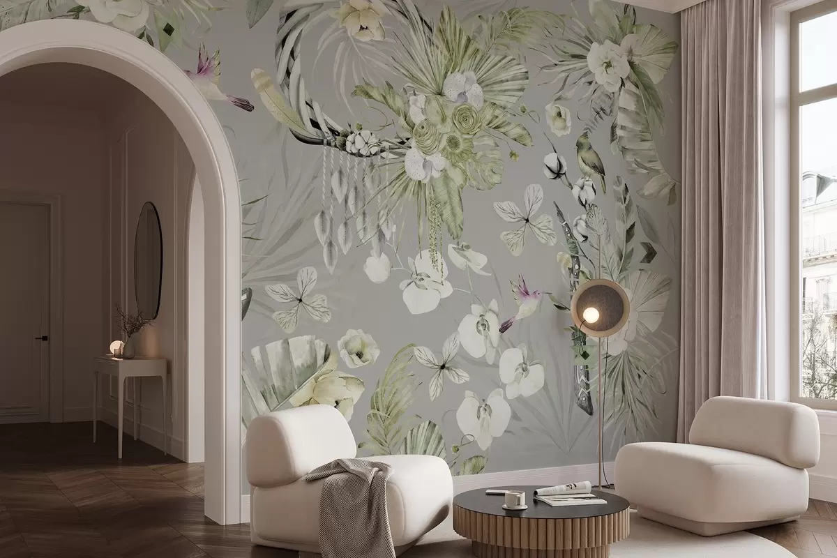 Fototapet Ozdoba v boho stylu s květy pivoněk a ptáky, akvarelový styl, zelené barvy w03885v2