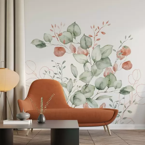 Fototapet Vegetace a větve imitující strukturovaný akvarel, odstíny zelené a červené barvy w03927v1