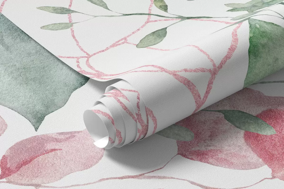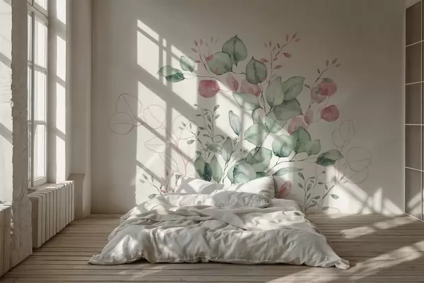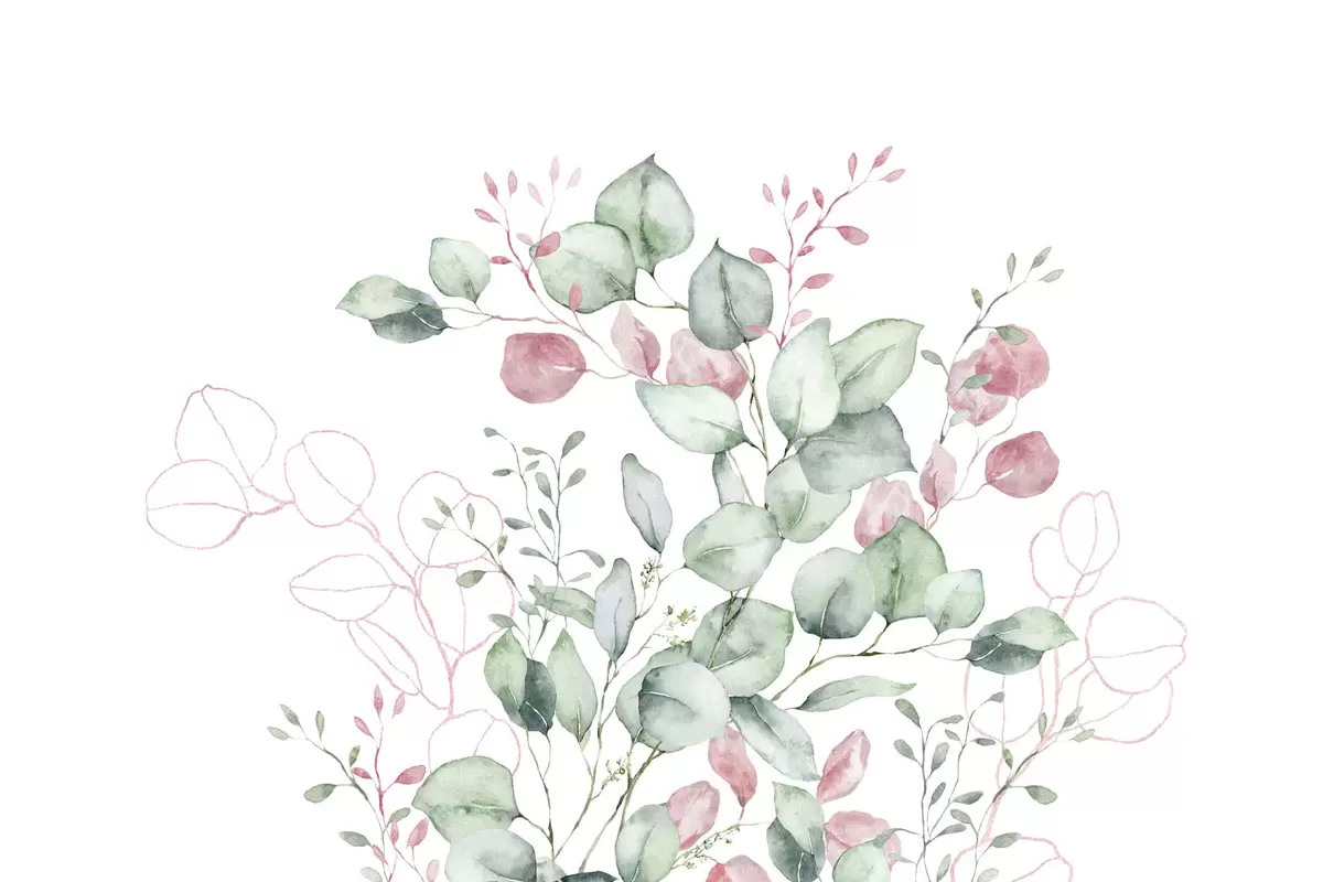 Fototapety Vegetace a větve imitující strukturovaný akvarel, odstíny zelené a růžové barvy Č. w03927v2