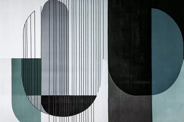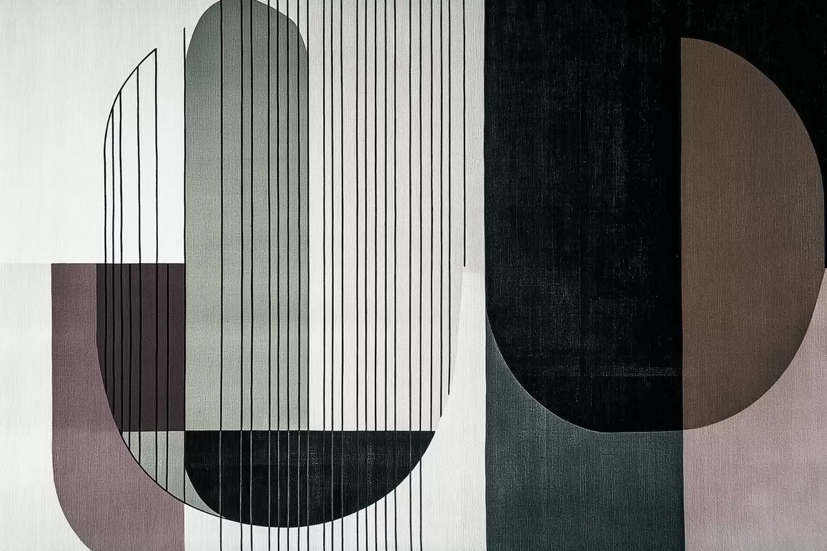 Fototapety moderní abstraktní geometrická kompozice s překrývajícími se tvary a svislými liniemi, tenké linie vyplňující lichoběžníky a ovály, měkké textilní textury, teplé tlumené tóny jako olivově zelená, šedá, béžová a dřevěné uhlí, jemné efekty průhlednosti mezi tvary Č. w03937v1