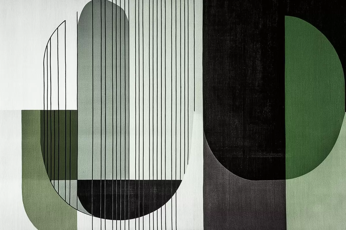 Fototapety moderní abstraktní geometrická kompozice s překrývajícími se tvary a svislými liniemi, tenké linie vyplňující lichoběžníky a ovály, měkké textilní textury, teplé tlumené tóny jako olivově zelená, šedá, béžová a dřevěné uhlí, jemné efekty průhlednosti mezi tvary Č. w03937v3