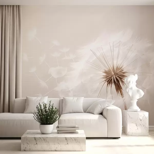 Fototapety Moderní měkká květinová kompozice s plně rozkvetlou hlavičkou pampelišky a plovoucími semínky, na pozadí jemné textilní textury Č. w03939