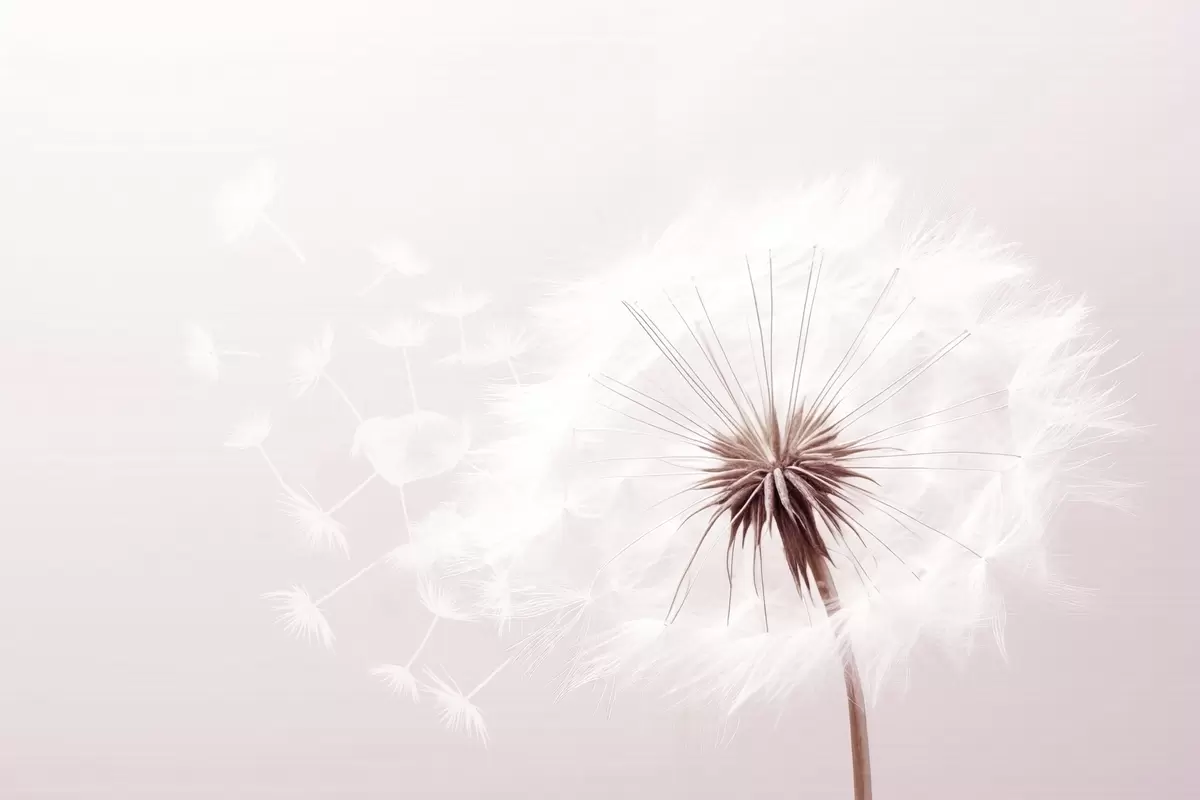 Fototapety Moderní měkká květinová kompozice s plně rozkvetlou hlavičkou pampelišky a plovoucími semínky, na pozadí jemné textilní textury Č. w03939v2