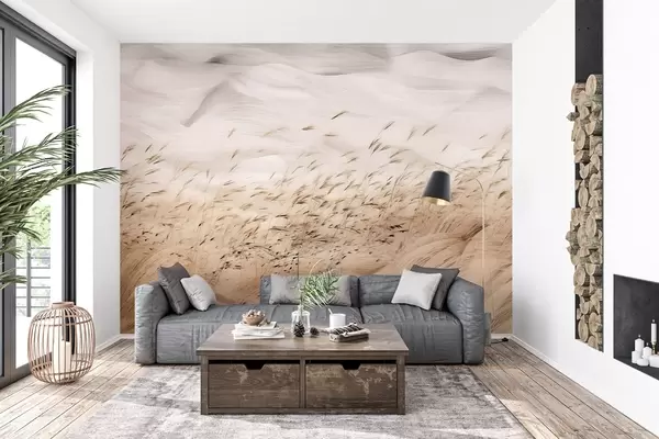 Fototapety abstraktní větrem rozfoukané travnaté pole v béžových a kamenných tónech, inkoustový náčrtek s texturovaným papírovým pozadím, severský venkovský klid Č. w03941