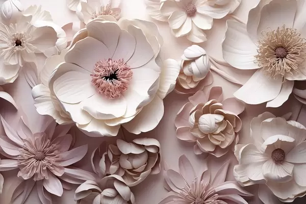 Fototapety Objemná květinová kompozice s jemnými okvětními lístky inspirovanými papírem nebo textilem v tónech slonové kosti, vanilky a rumělky na teplém béžovém plátně. Č. w03945v1