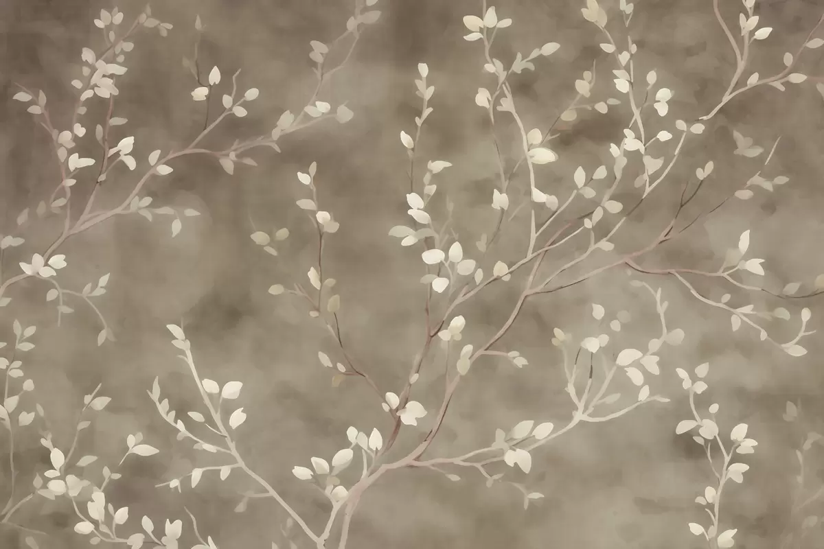 Fototapety minimalistický ručně malovaný vzor tapety s jemnými bílými větvemi stromů s jemnými listy, které se organicky větví na tlumeném šalvějově zeleném pozadí, jemné botanické linie v přirozeném toku Č. w03949v1