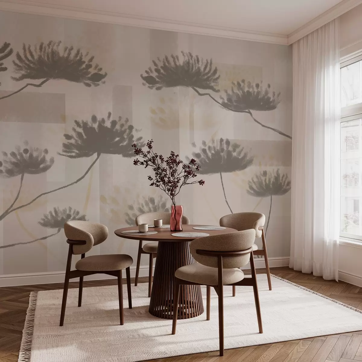 Fototapety geometrie s texturou v béžových a krémových tónech se stylizovanými květy deštníků Č. w03960