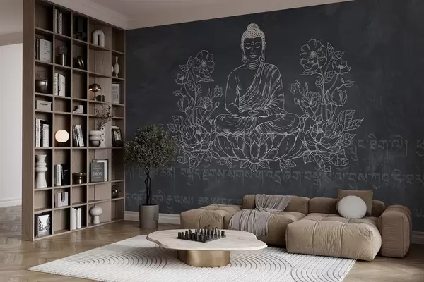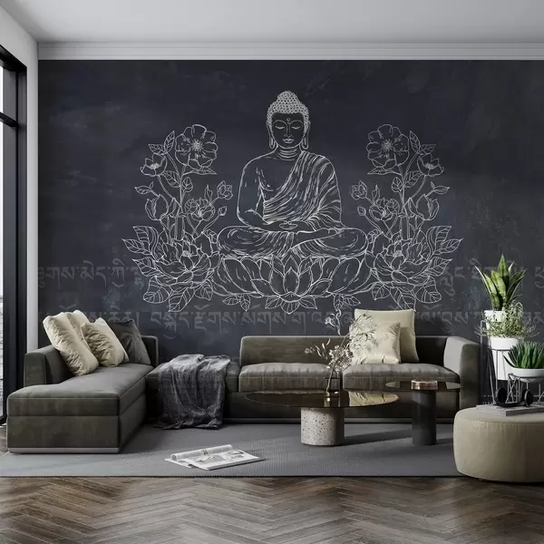 Fototapety Meditující Buddha s lotosovými květy, čárové umění, orientální, tmavé pozadí Č. w04008