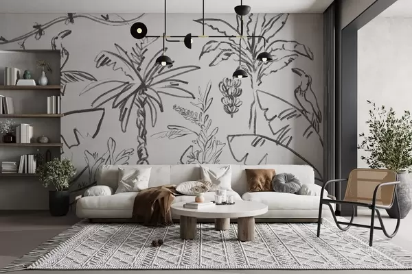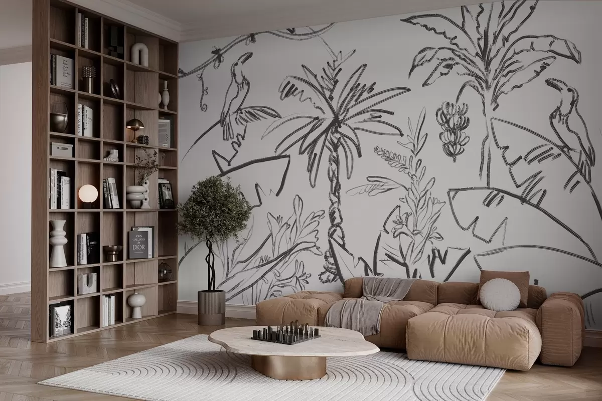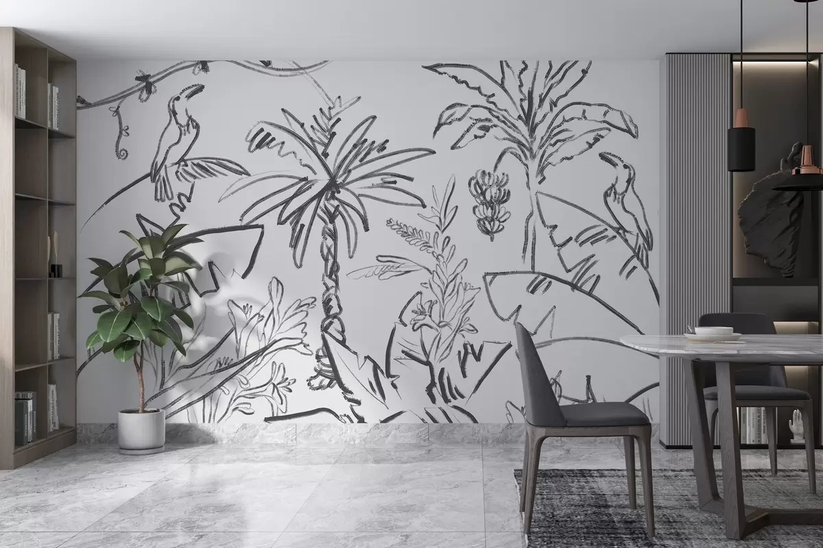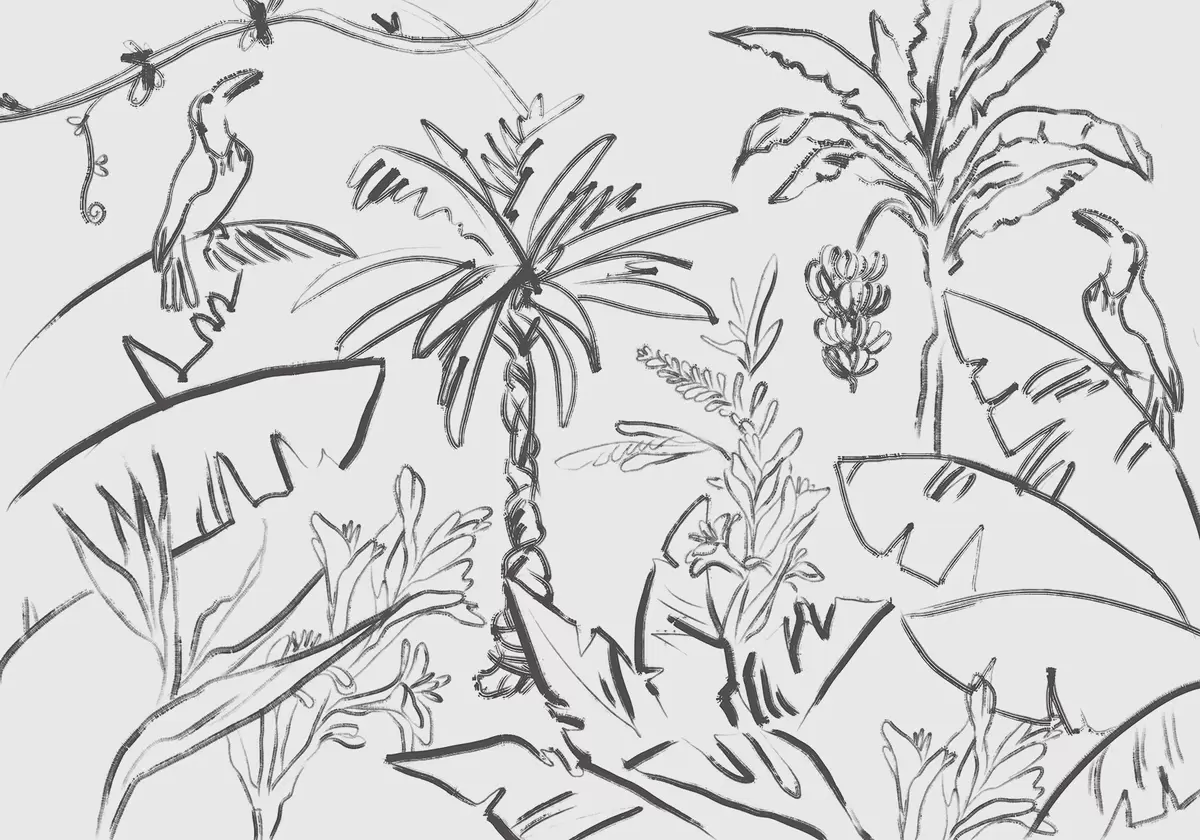 Fototapety Tropická čárová kresba, banány, palmy, obrysová grafika Č. w04020