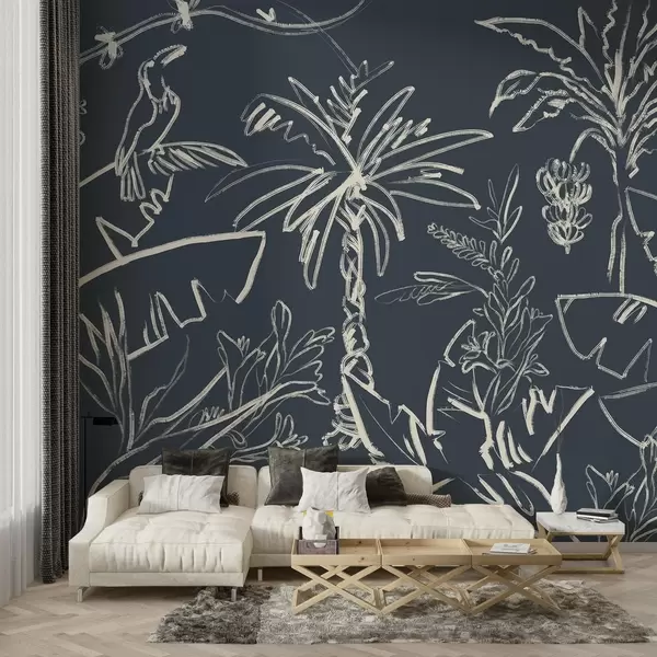 Fototapety Tropický vzor na tmavě modrém pozadí, palmy, banány Č. w04020v4