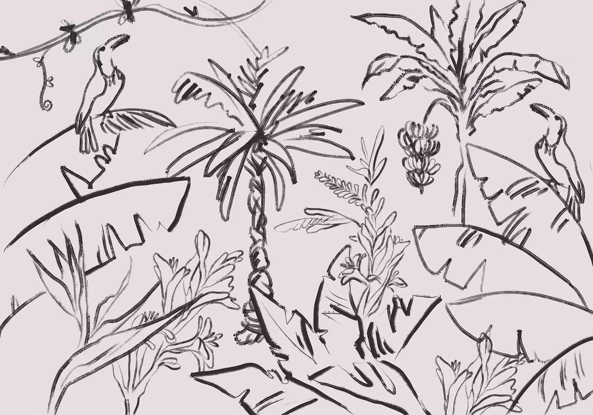 Fototapety Tropický vzor v černé barvě, palmy, banány, obrysová grafika Č. w04020v7