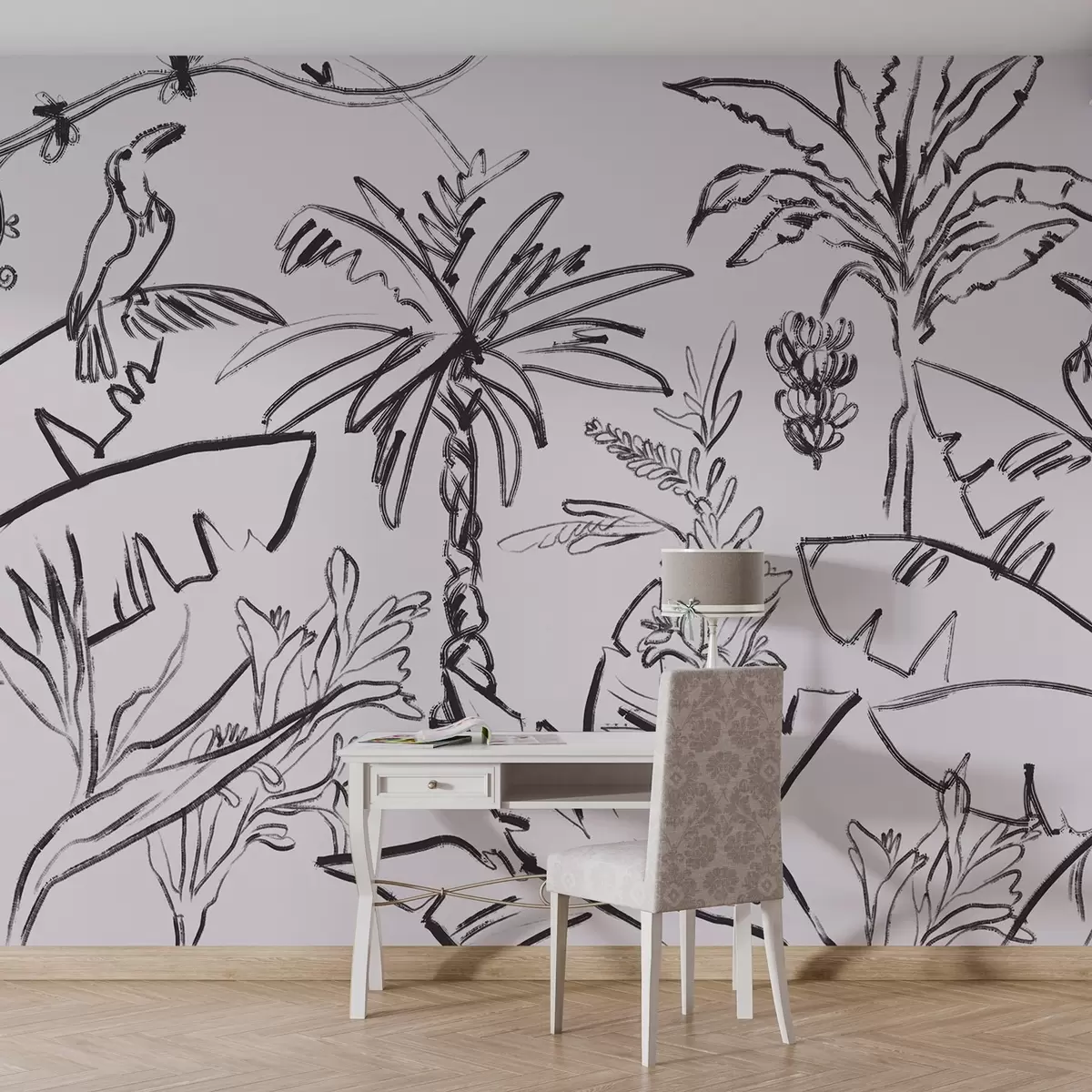 Fototapety Tropický vzor v černé barvě, palmy, banány, obrysová grafika Č. w04020v7