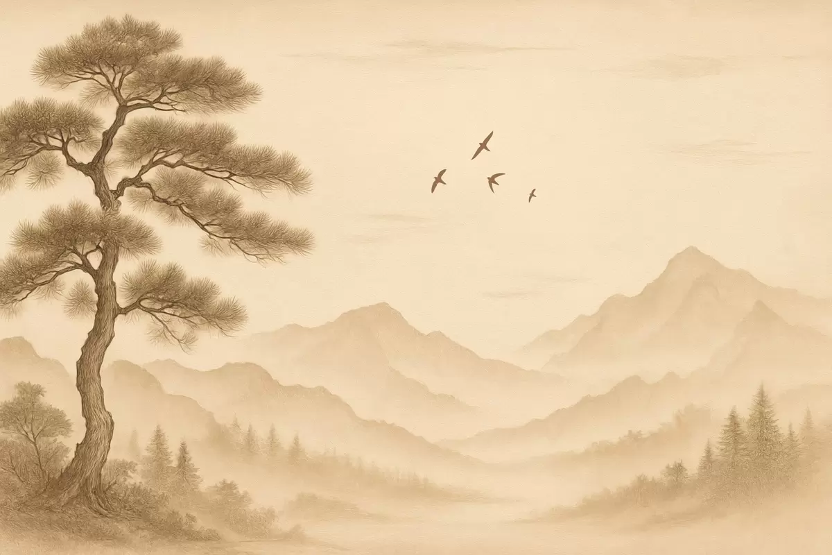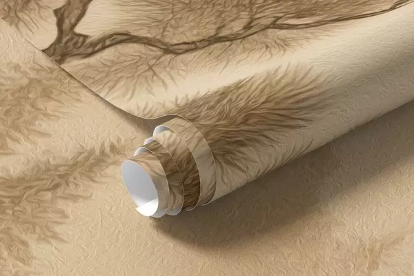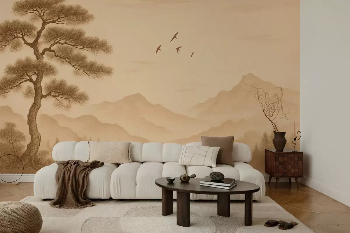 Fototapety panorama kopců s velkým stromem v sépiovém stylu Č. w04033