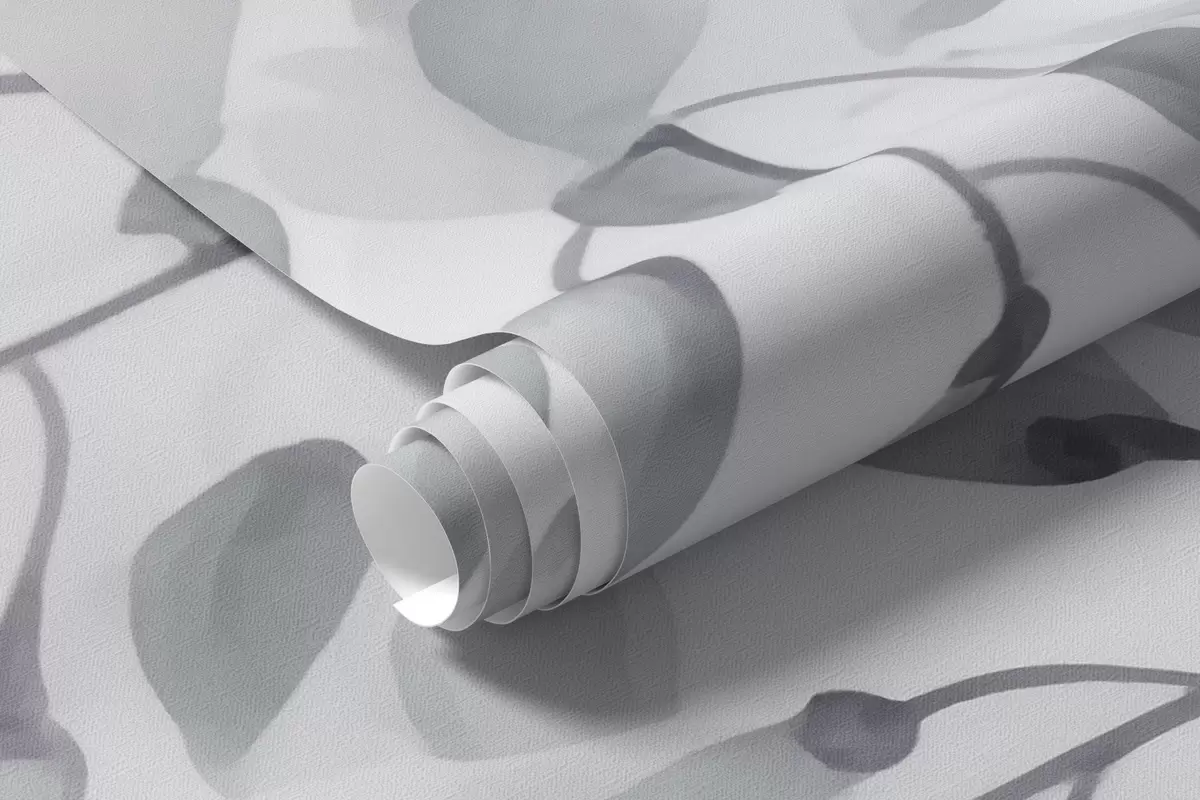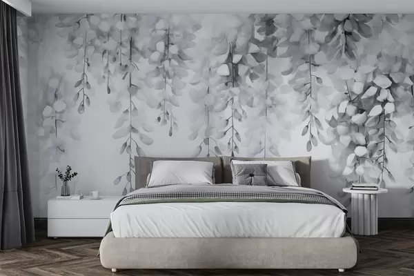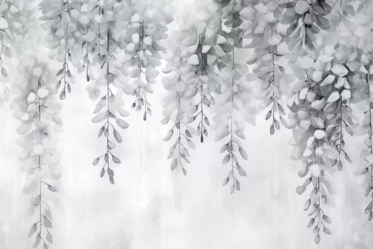 Fototapety Monochromatický akvarel s kaskádovitou vistárií v chladných stříbrných a bílých tónech, který evokuje klid a zimní měkkost Č. w04034v1