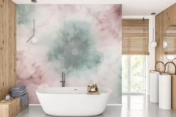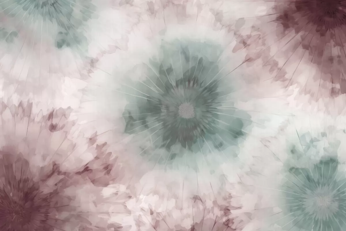 Fototapety Akvarelový radiální vzor prolínající se s mlhavou zelení a prašnou růžovou, který evokuje jemnost ranní rosy a první závan dne Č. w04036v2