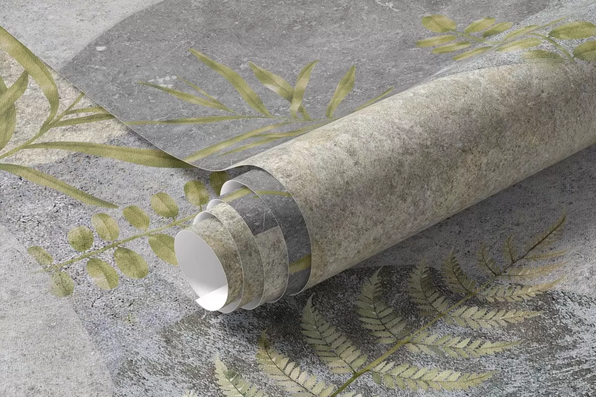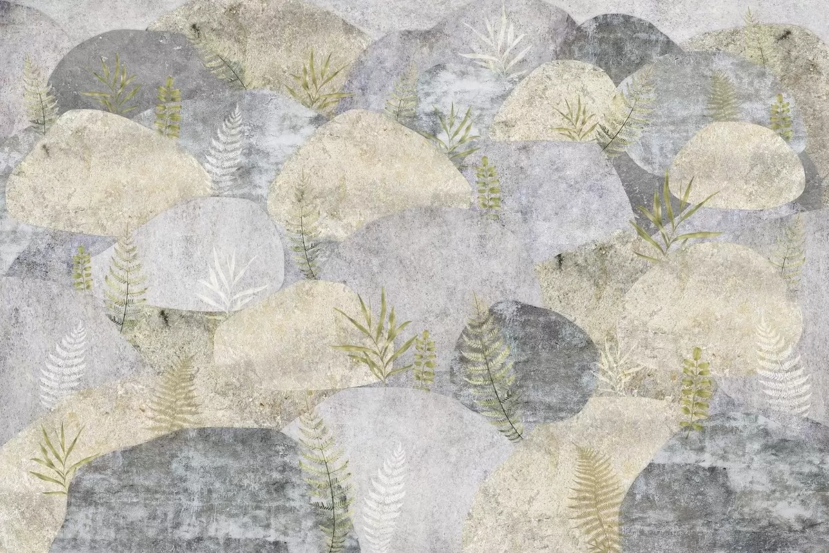 Fototapety Kameny s rostlinami, kapradí, severský, rustikální styl, šedá a písková barva Č. w04064
