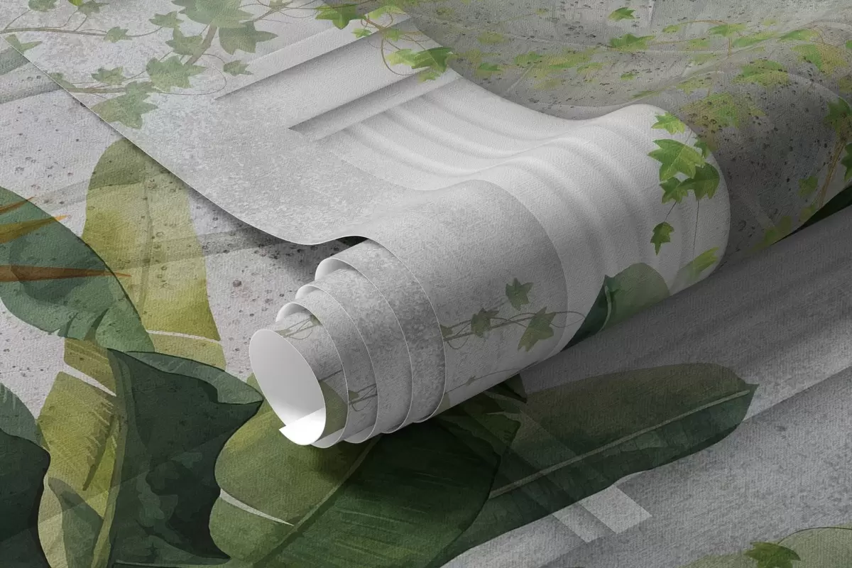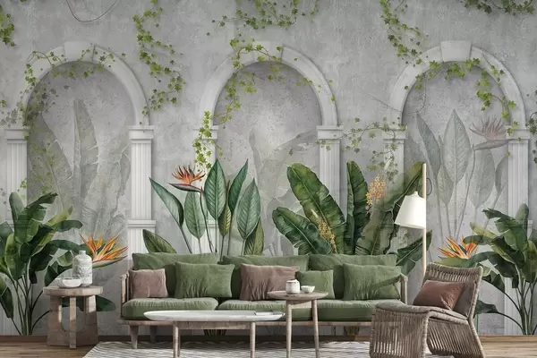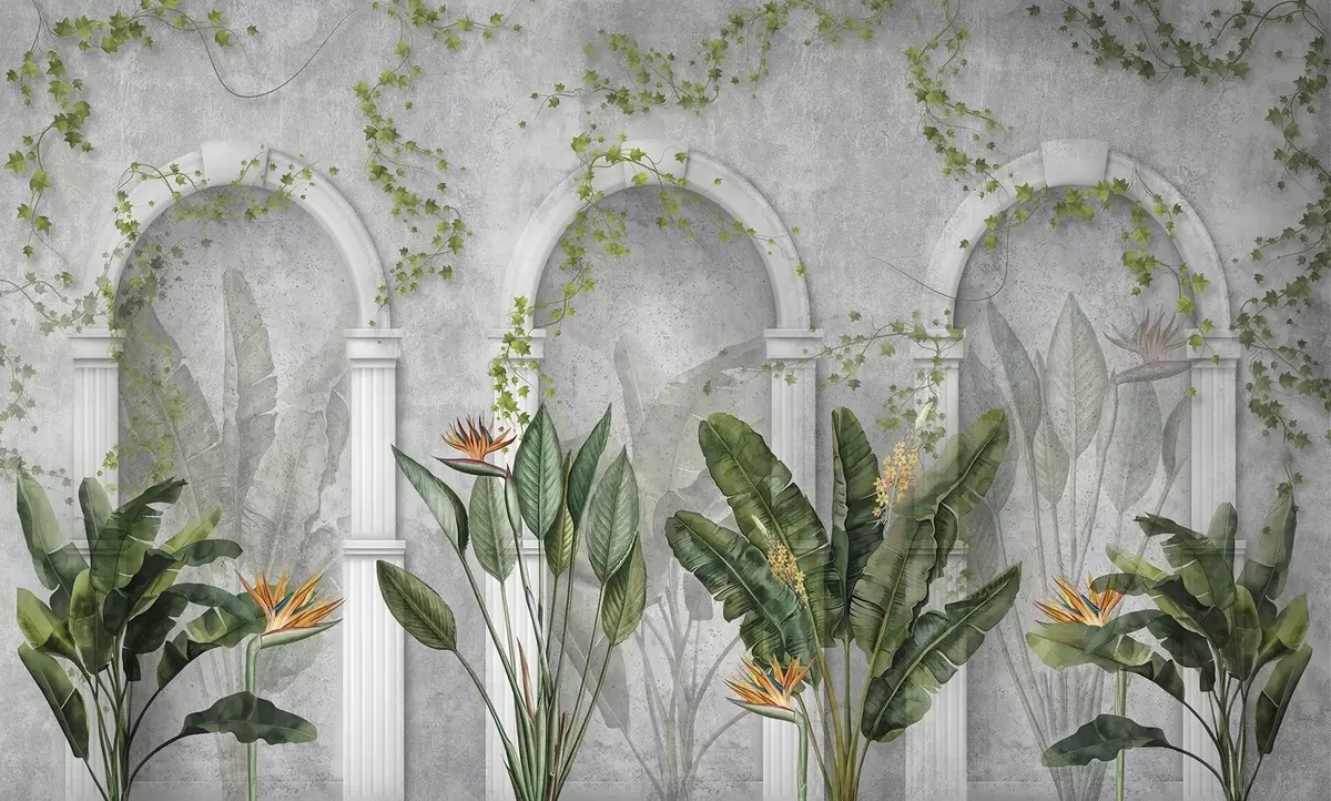 Fototapety Betonová stěna s oblouky a tropickými rostlinami, květinová, přírodní barvy Č. w04065
