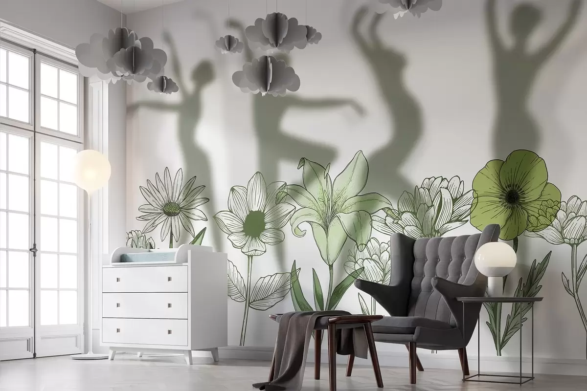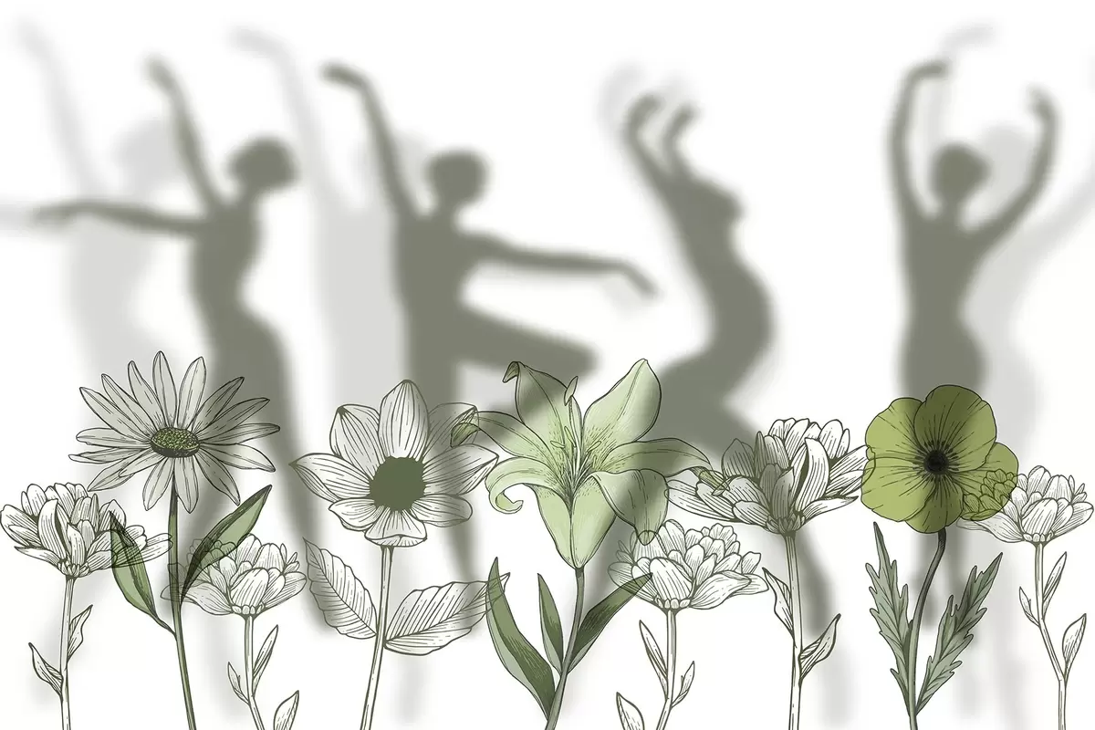Fototapety Siluety baletek, rustikální květiny, line art, zelené barvy Č. w04069v1