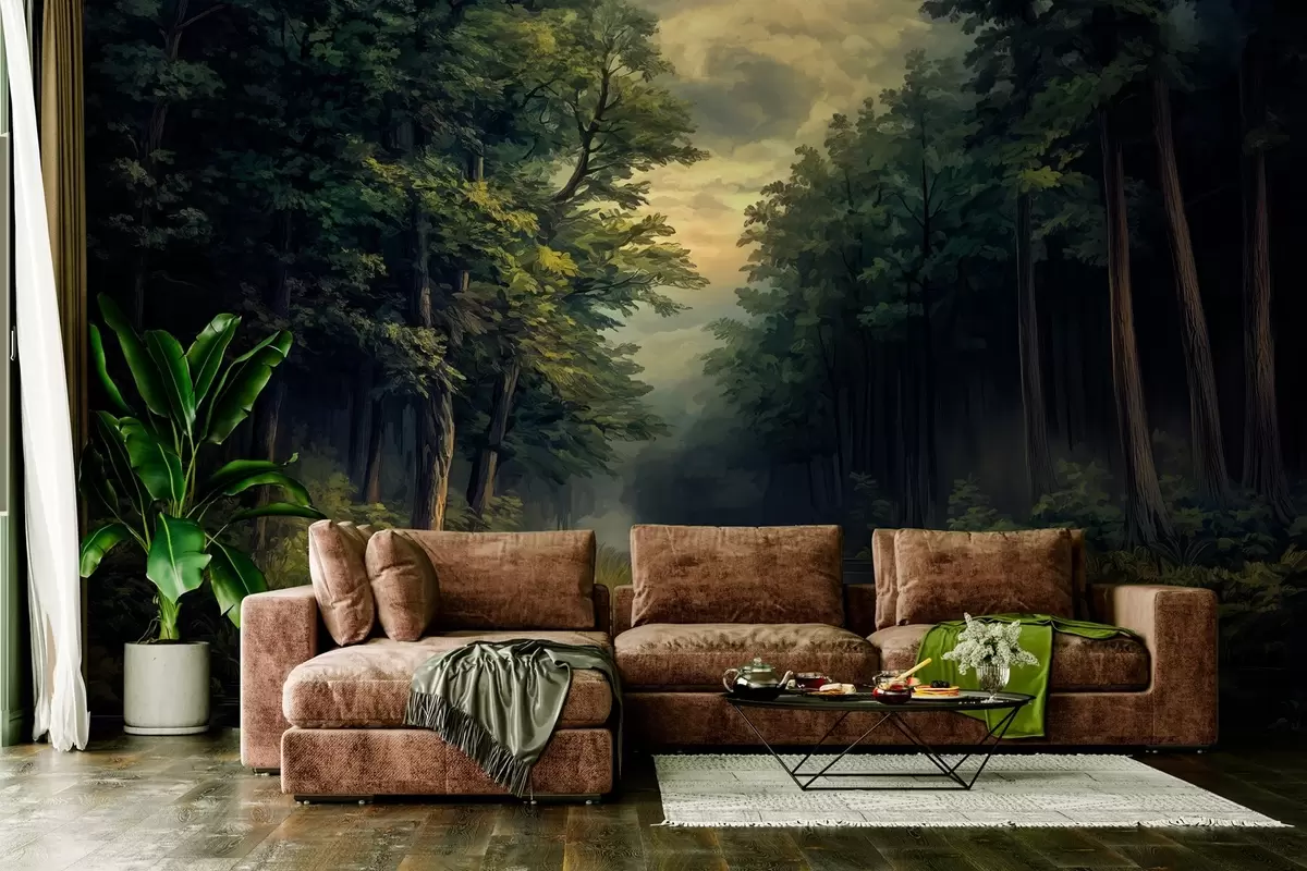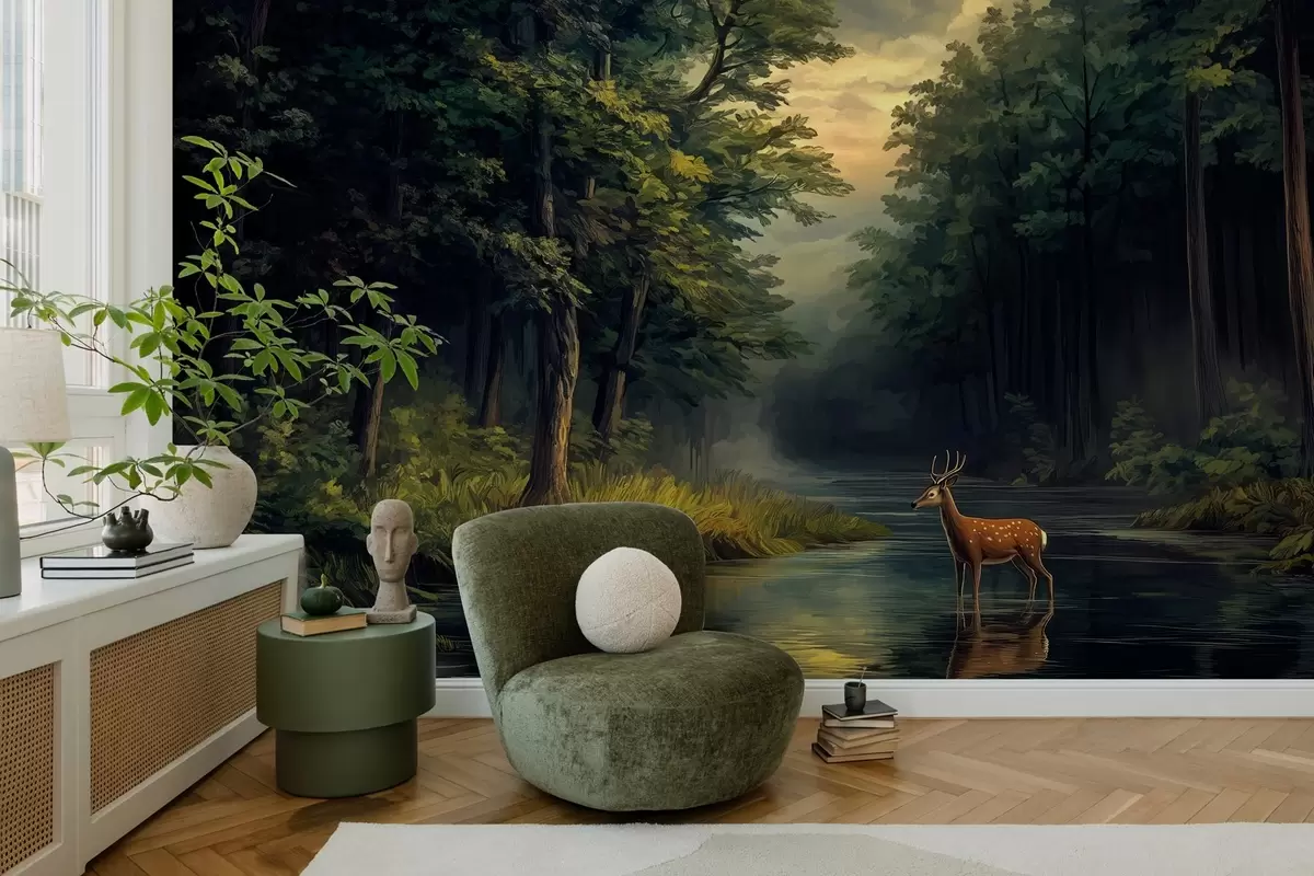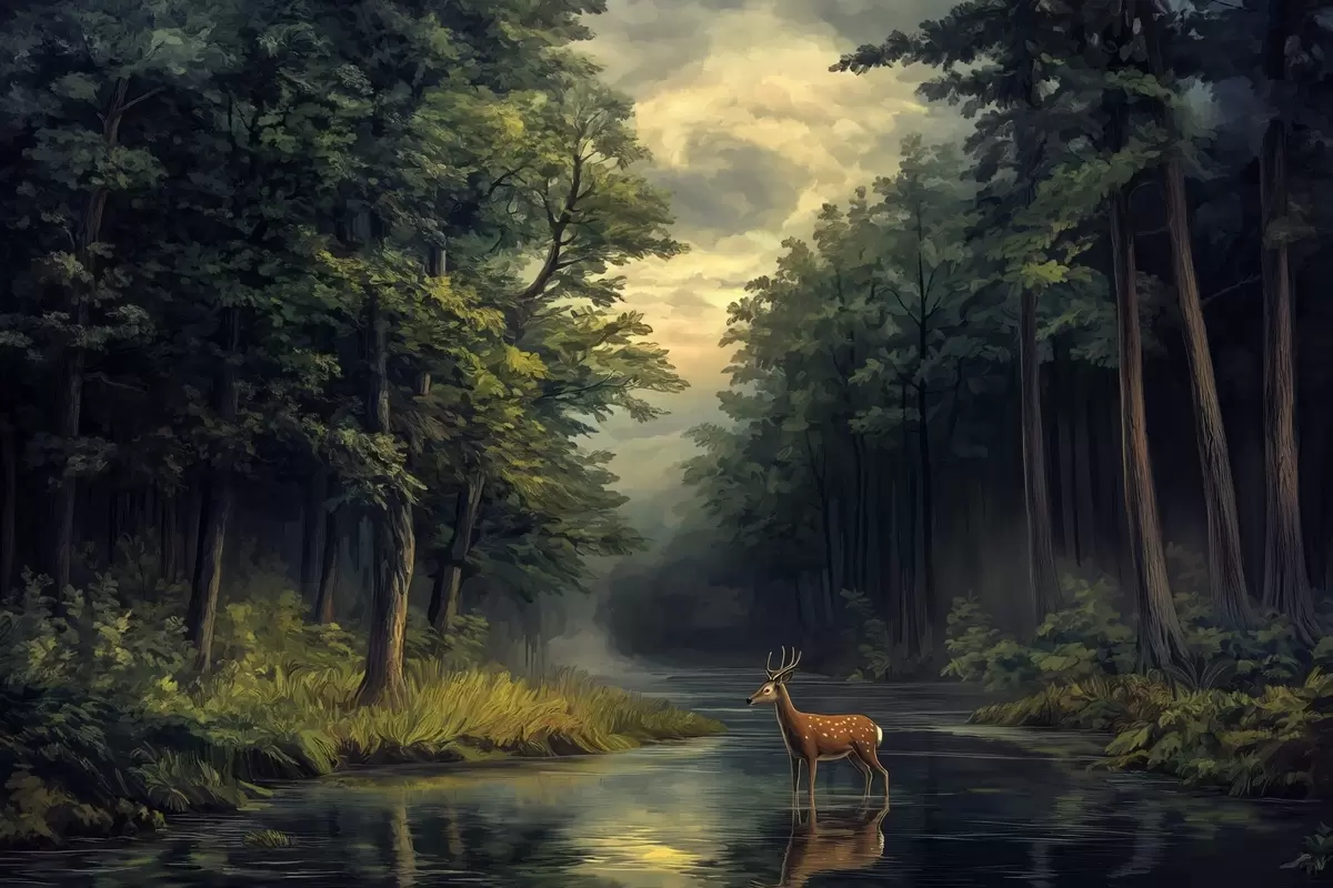 Fototapety Les s jeleny a řekou ve stylu holandské olejomalby Č. w04072