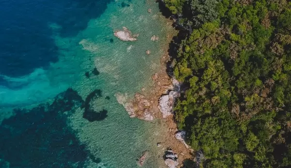 Fototapety Španělsko mořské pobřeží s mořskou vodou, borovicový les, letecké fotografie Č. w04099