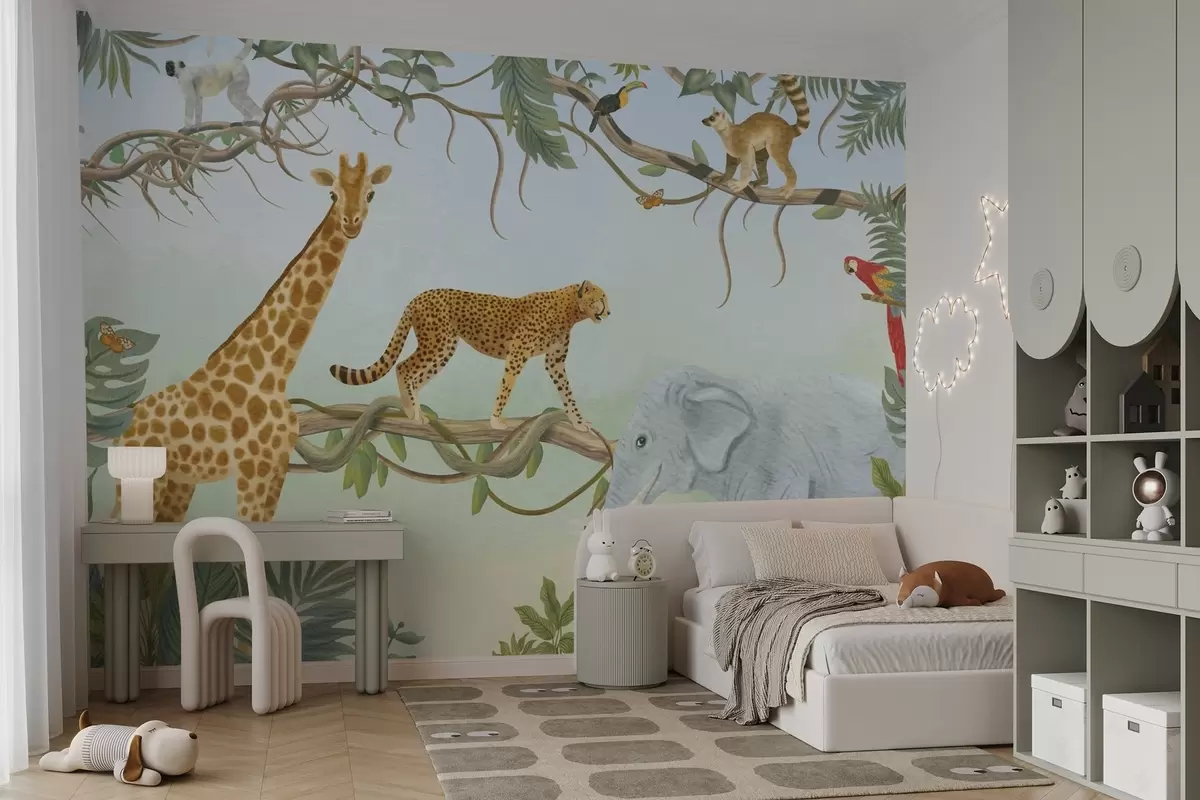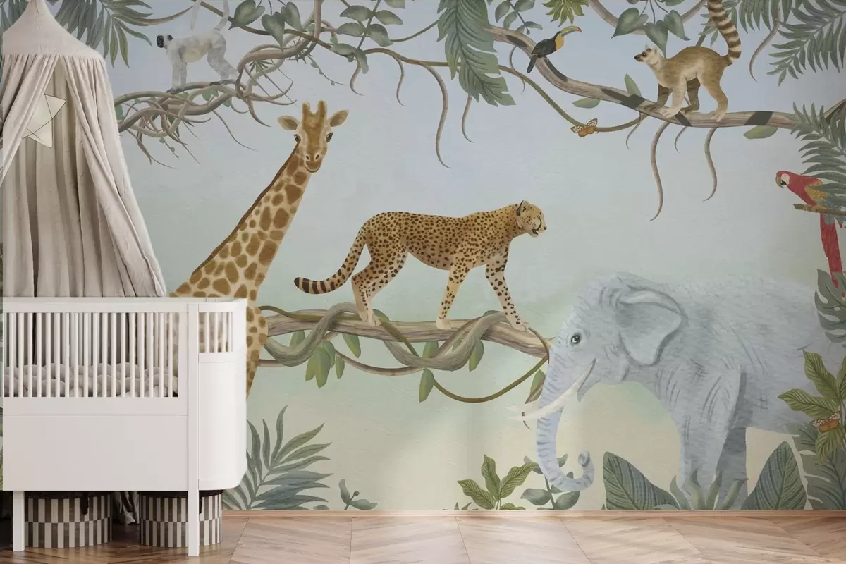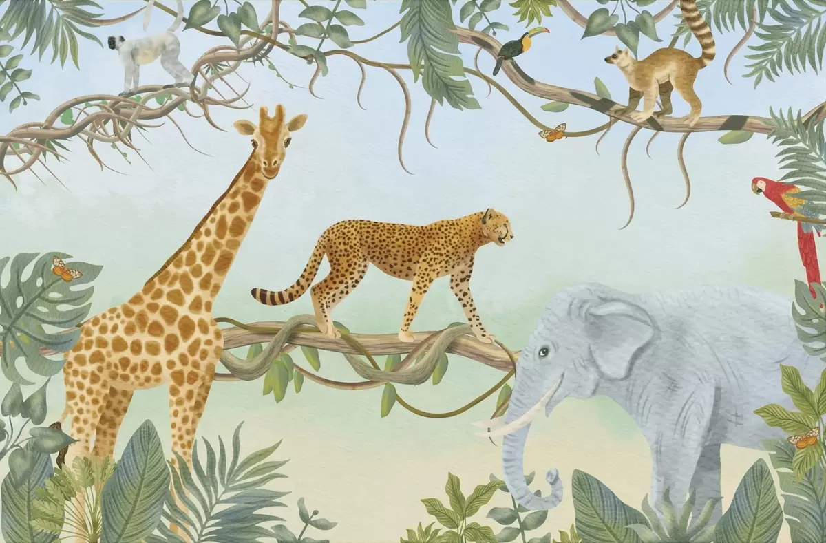 Fototapety Ilustrace džungle s žirafou, gepardem a slonem Č. w04194