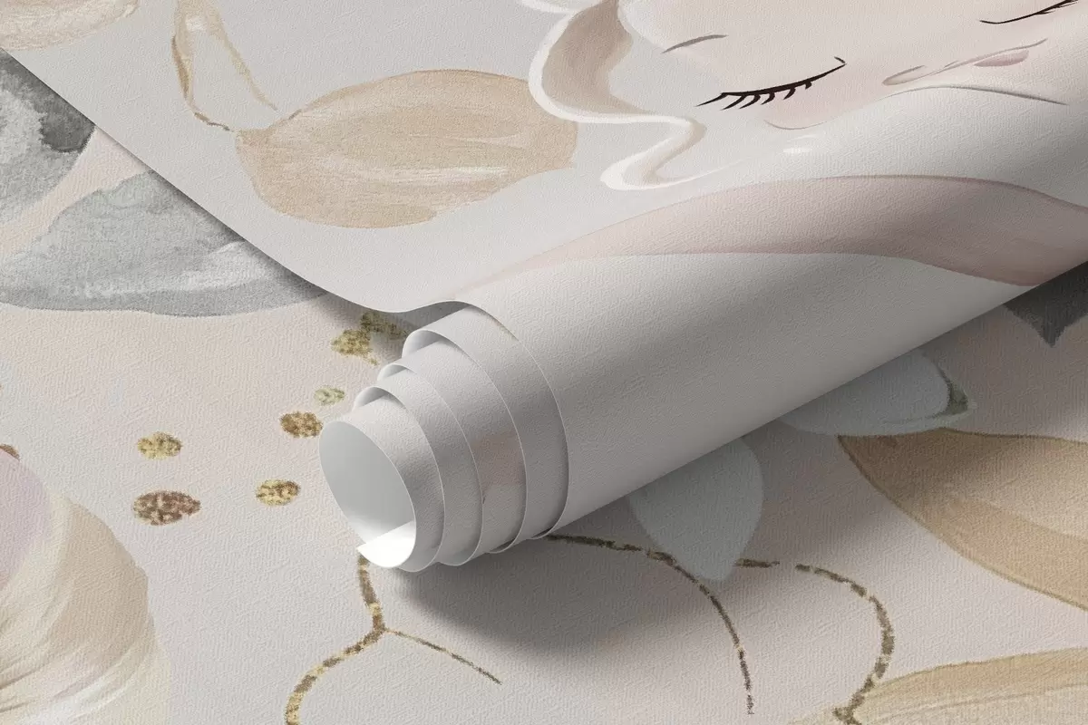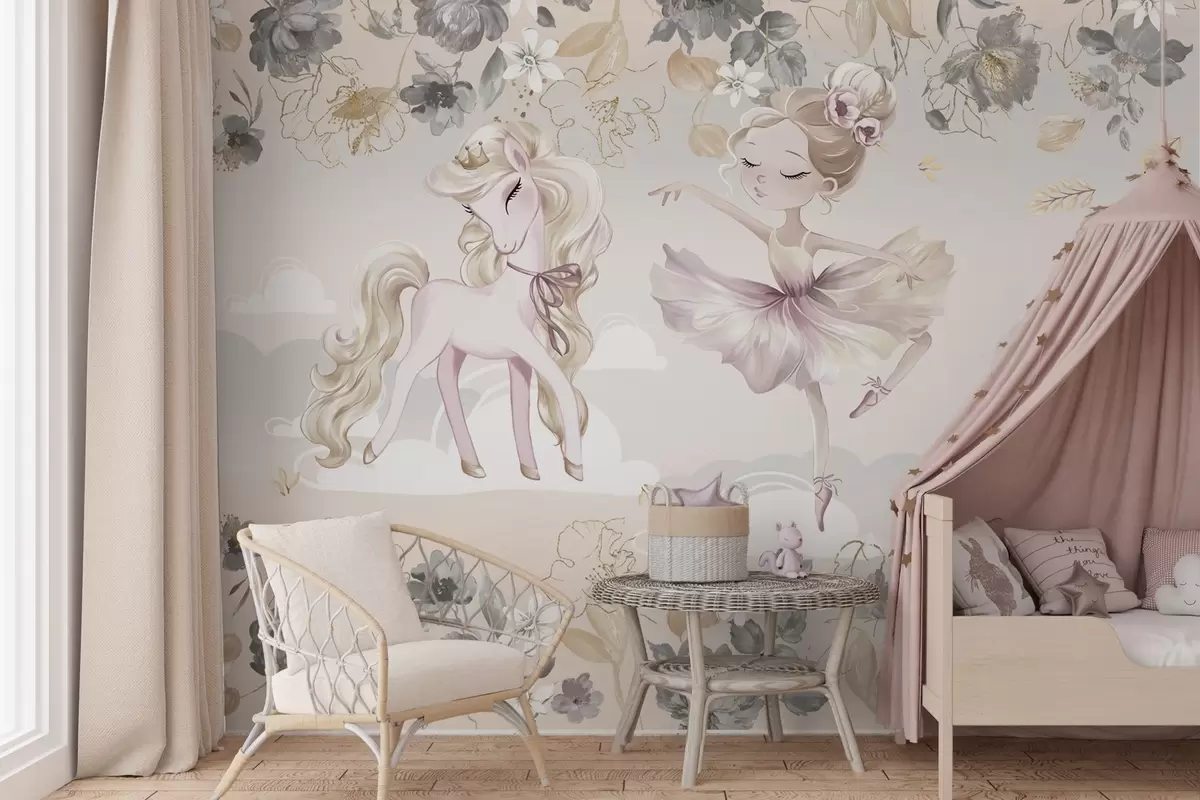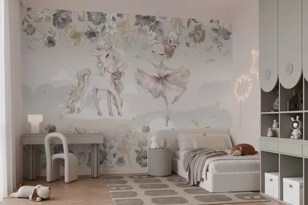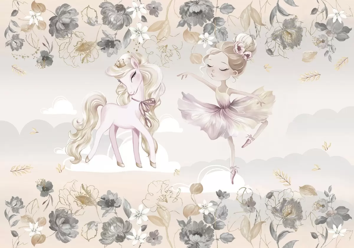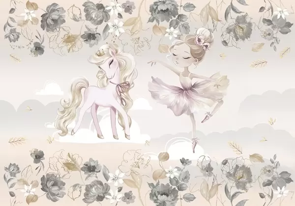 Fototapety Sněhobílý poník a baletka mezi květinami a mraky Č. w04419