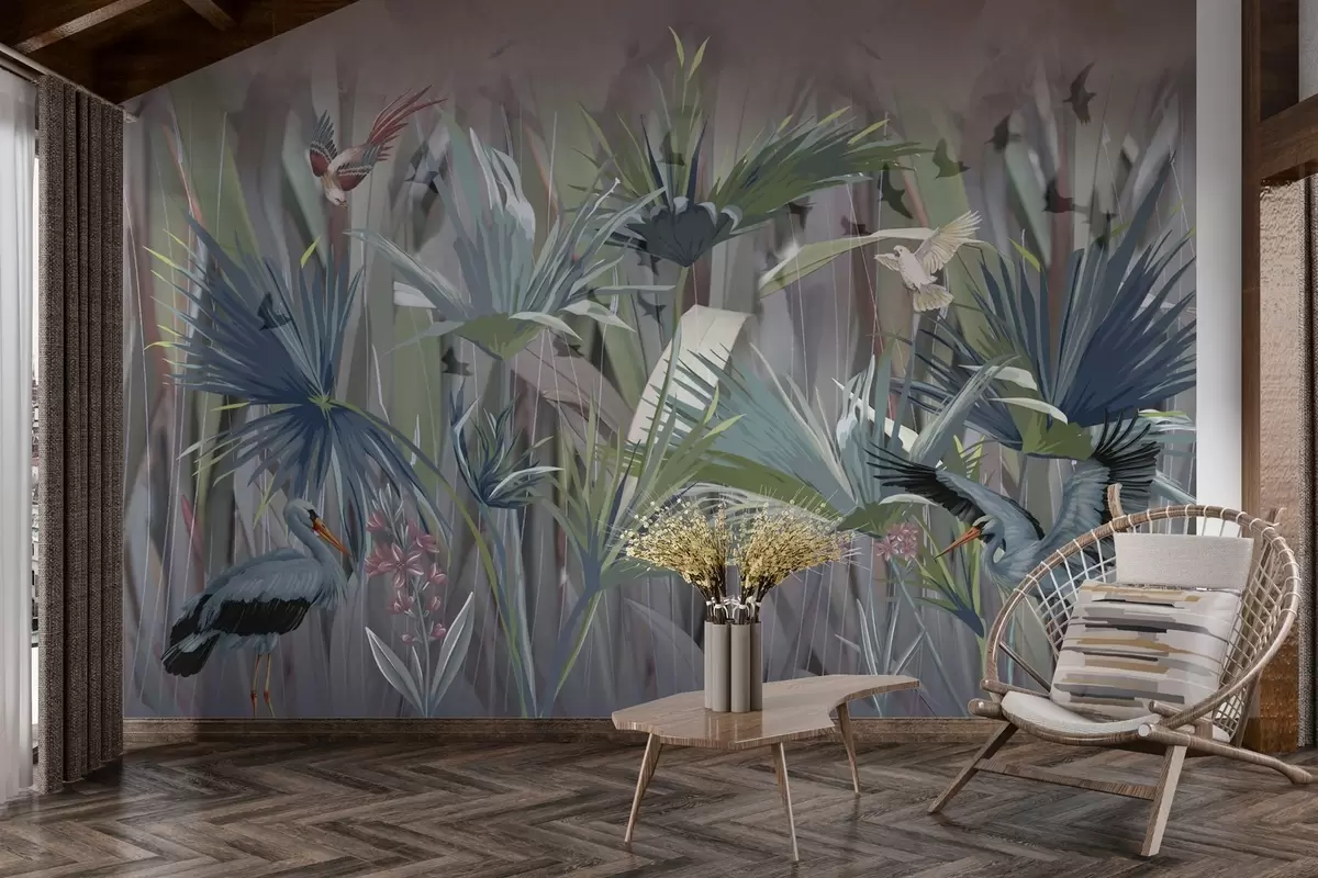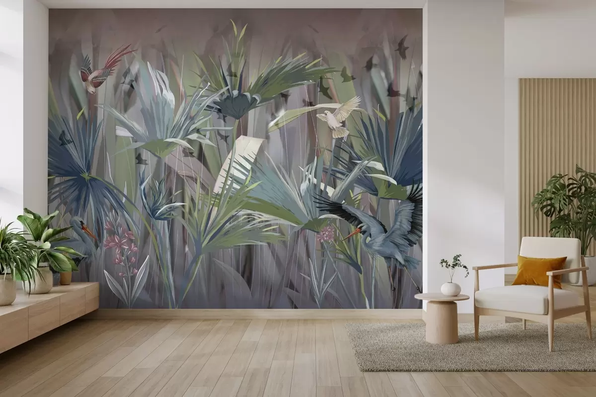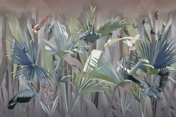 Fototapety Exotičtí ptáci mezi palmovými listy a květy Č. w04458