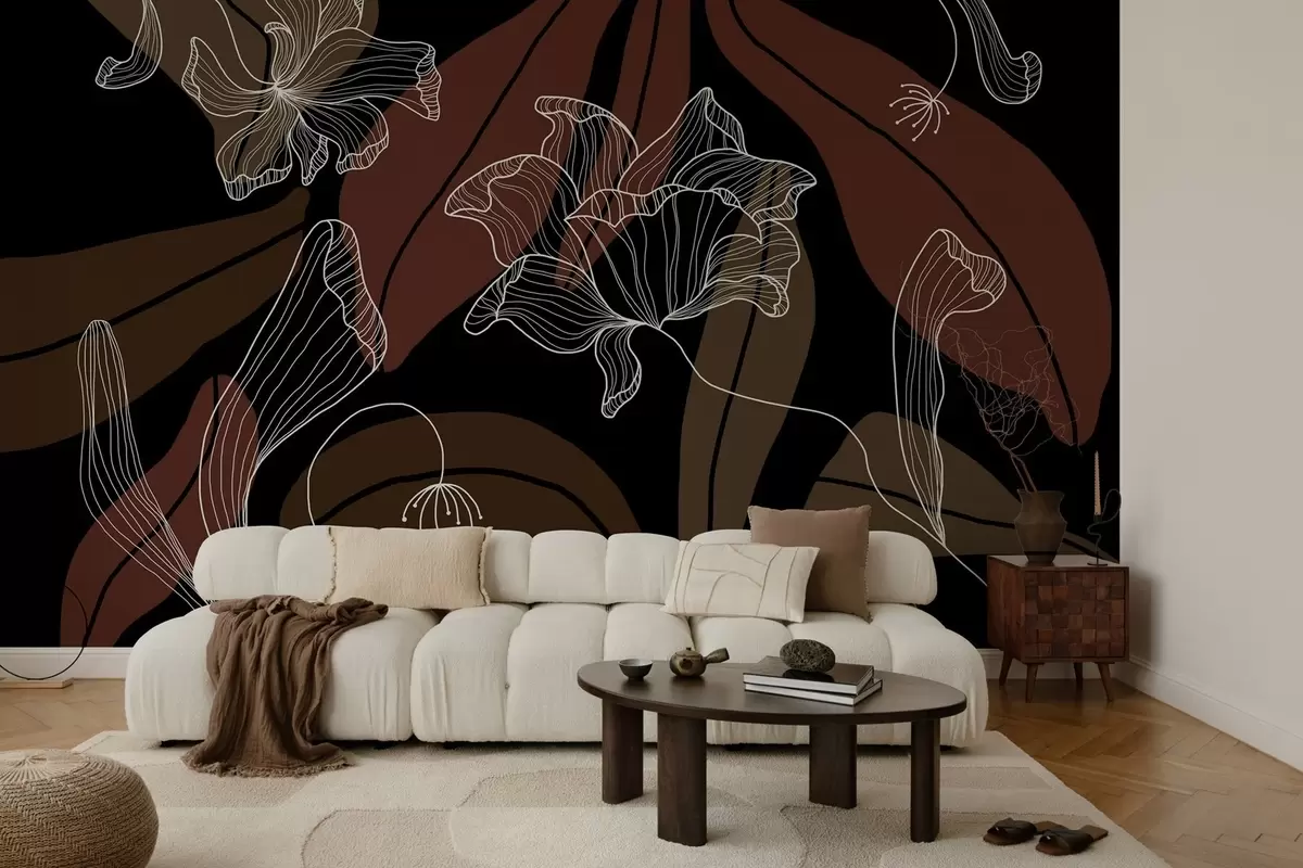 Fototapety abstraktní listy a květy v pudrových a béžových tónech na tmavém pozadí Č. w04499v3
