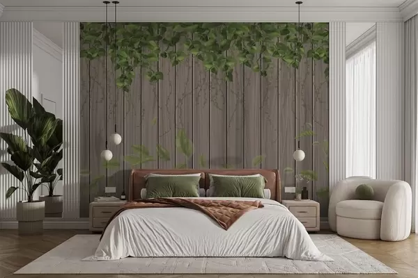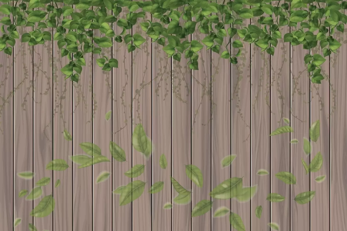 Fototapety Imitace dřevěných desek s visícími listy Č. w04603
