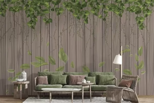 Fototapety Imitace dřevěných desek s visícími listy Č. w04603