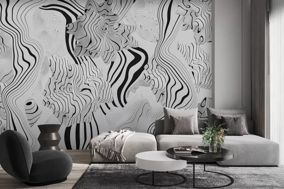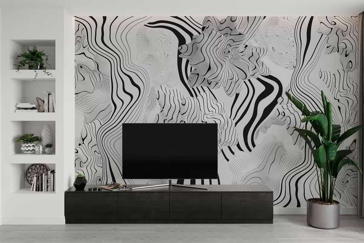 Fototapety abstraktní organické tvary ve 3D stylu v bílé a šedé barvě s černými pruhy Č. w04627