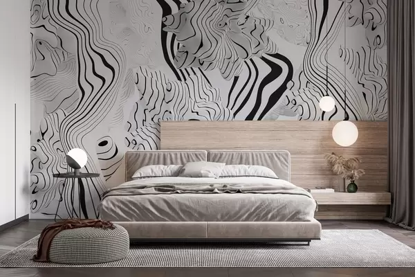 Fototapety abstraktní organické tvary ve 3D stylu v bílé a šedé barvě s černými pruhy Č. w04627
