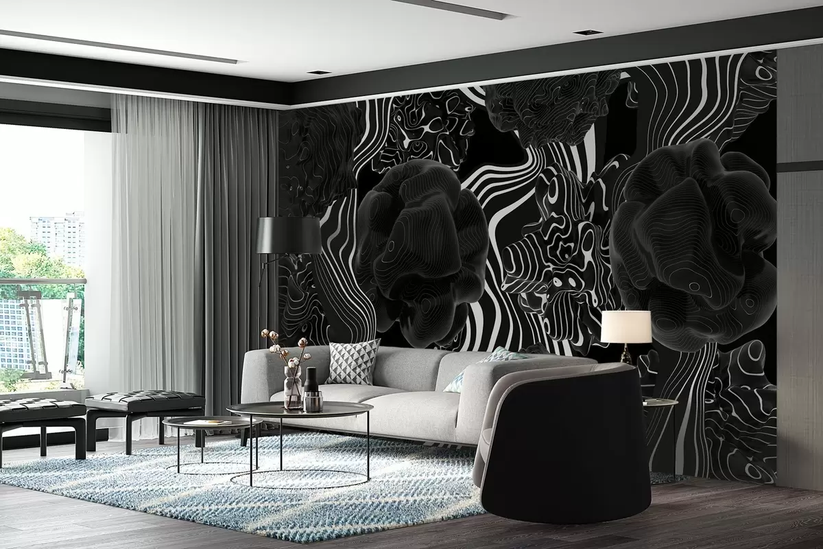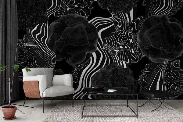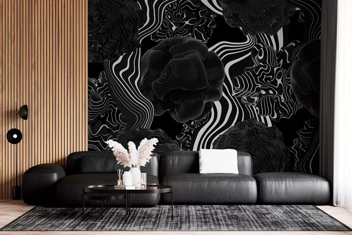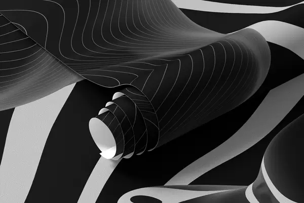 Fototapety abstraktní organické tvary ve 3D stylu v černých tónech s bílými pruhy Č. w04628