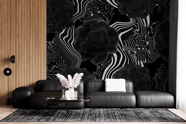 Fototapety abstraktní organické tvary ve 3D stylu v černých tónech s bílými pruhy Č. w04628