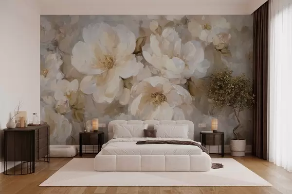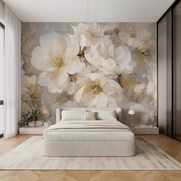 Fototapety velké květy v bílé a béžové barvě ve stylu olejomalby Č. w04633