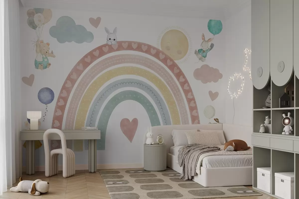 Fototapety Pastelová duha se srdíčky, zvířátky a balónky Č. w04681