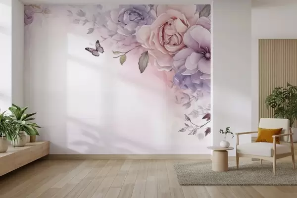 Fototapety Jemné růžové a lila květy s motýlem Č. w04711